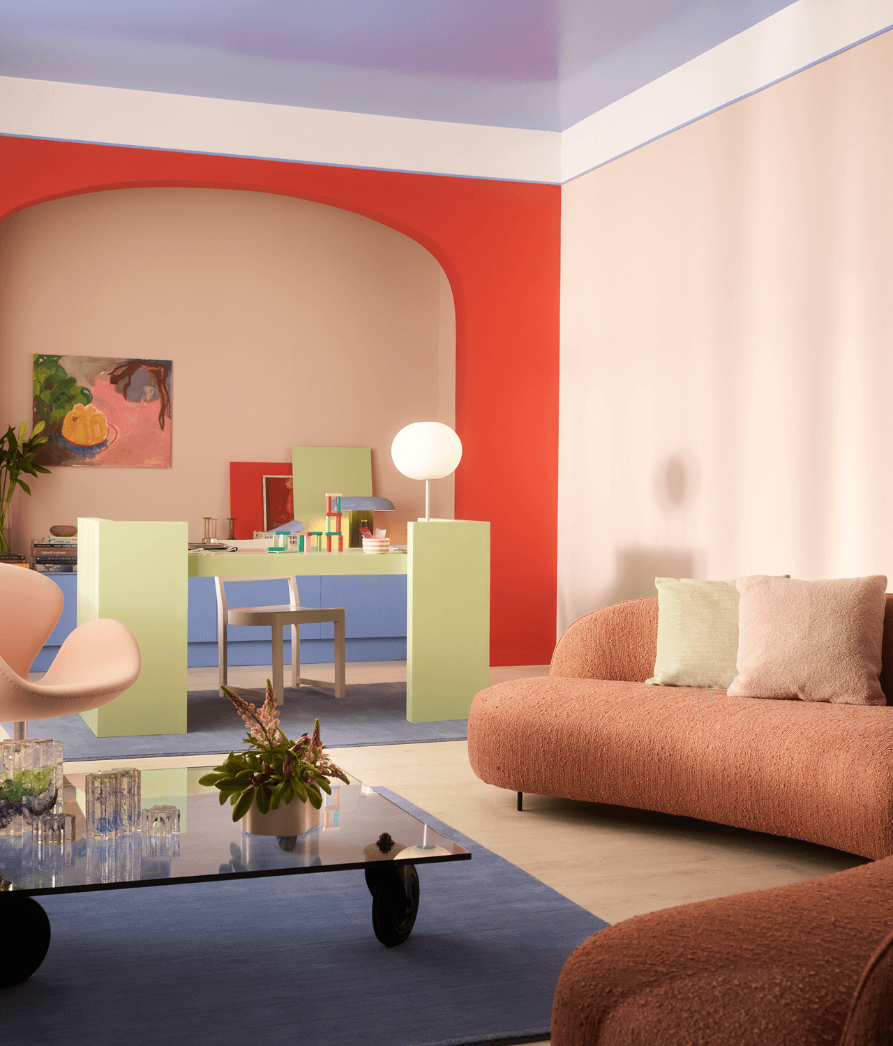 Una palette vibrante e audace, dove Secret Safari si combina con tonalità intense come blu elettrico, rosa shocking e verde lime. Contrasti decisi, color blocking e superfici lucide danno vita ad ambienti energici, originali e ricchi di carattere.