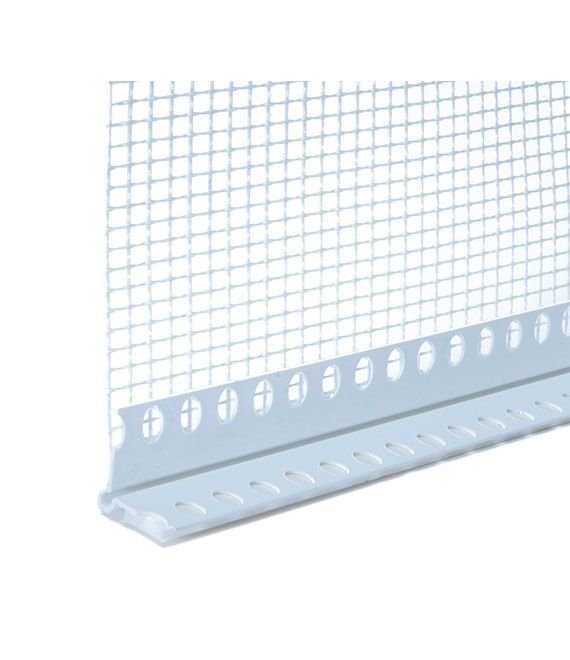 Profilo in PVC con nastro autoadesivo in PE e rete in fibra di vetro R131 impiegato come raccordo sigillante tra il pannello isolante e profili di copertura sottodavanzale in alluminio, marmi di porte e finestre, cassonetti di avvolgibili, etc. DIMENSIONI 25x25x2000 MM